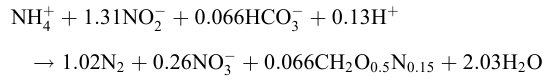 該反應(yīng)以NH4+作電子供體,NO3-或NO2-為電子受體,將水體中的氮轉(zhuǎn)變成N2。厭氧氨氧化過程是在自養(yǎng)菌作用下完成,這種自養(yǎng)菌生成速度慢,泥齡長,但產(chǎn)生的剩余污泥量較少。厭氧氨氧化總的化學(xué)計(jì)量方程式: