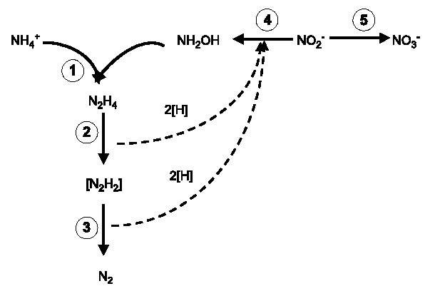 NH4+與羥胺氧化成聯(lián)胺,聯(lián)胺經(jīng)過兩次脫氫氧化(2、3),最終生成N2。生成的聯(lián)胺與NO2-反應(yīng)生成羥胺。